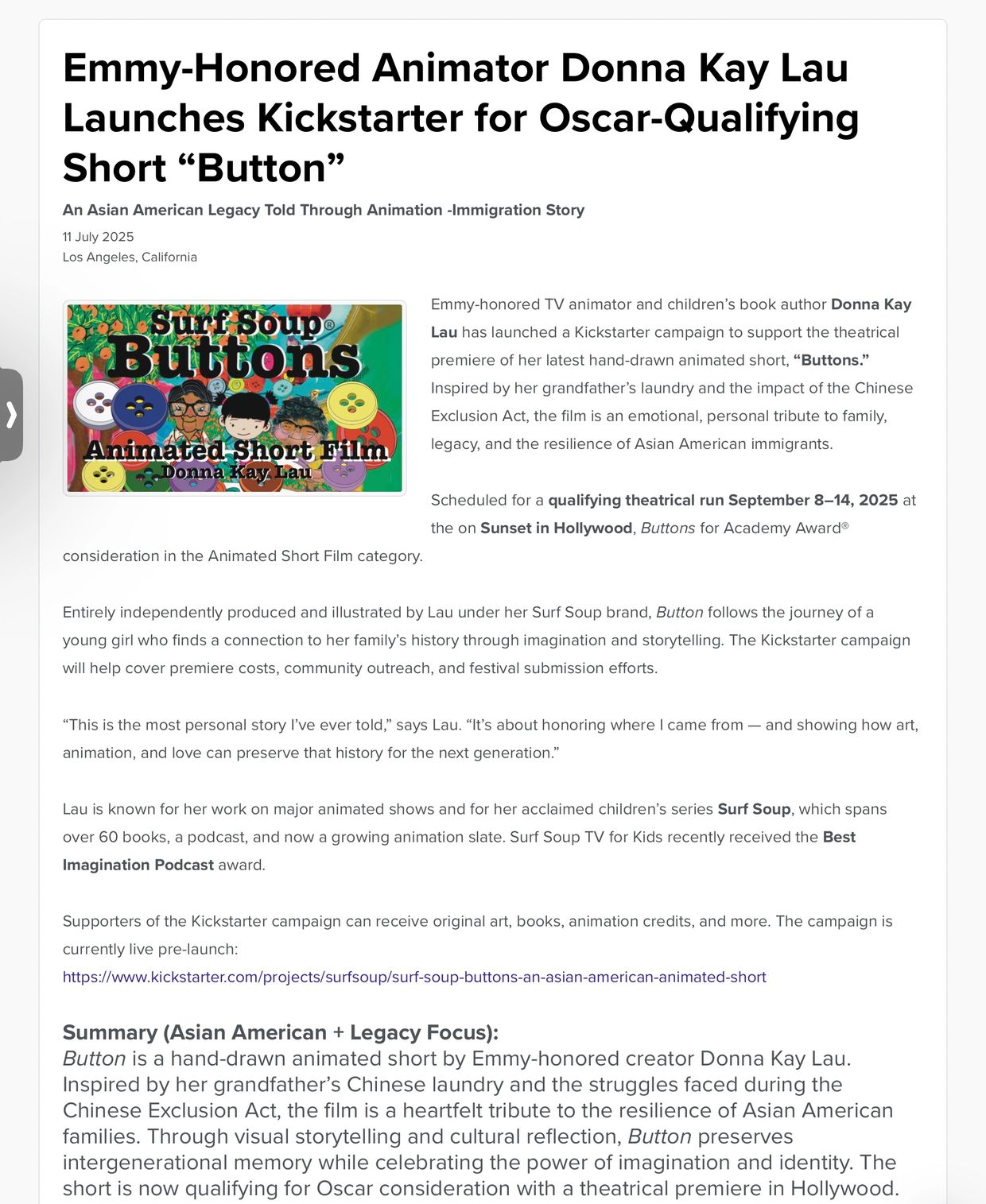 🎉 It’s Here! Watch the official trailer for Surf Soup®: Buttons — an animated short film by Emmy-honored animator Donna Kay Lau, based on a heartwarming real-life Asian American immigration story.